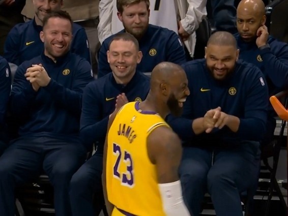 本赛季在湖人于丹佛赢球之前,詹姆斯见到了他的老友、掘金助教贾里德·杜德利,他一只手假装摇动手柄,另一只手竖起了中指。